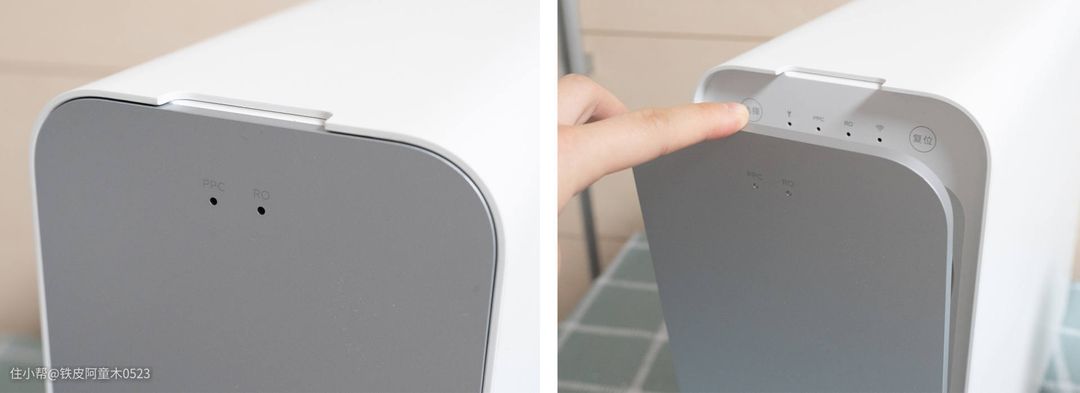 面板外部分别有PPC和RO膜两个滤芯的使用情况指示灯,如需更换滤芯时,指示灯会亮起。
