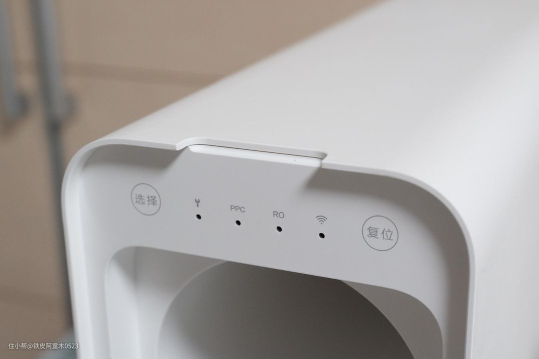 拆下面板,主机顶部有隐藏式触控按键与指示灯,分别是:滤芯选择按键、异常指示灯、PPC滤芯指示灯、RO膜滤芯指示灯、WIFI连接指示灯、滤芯复位按键。