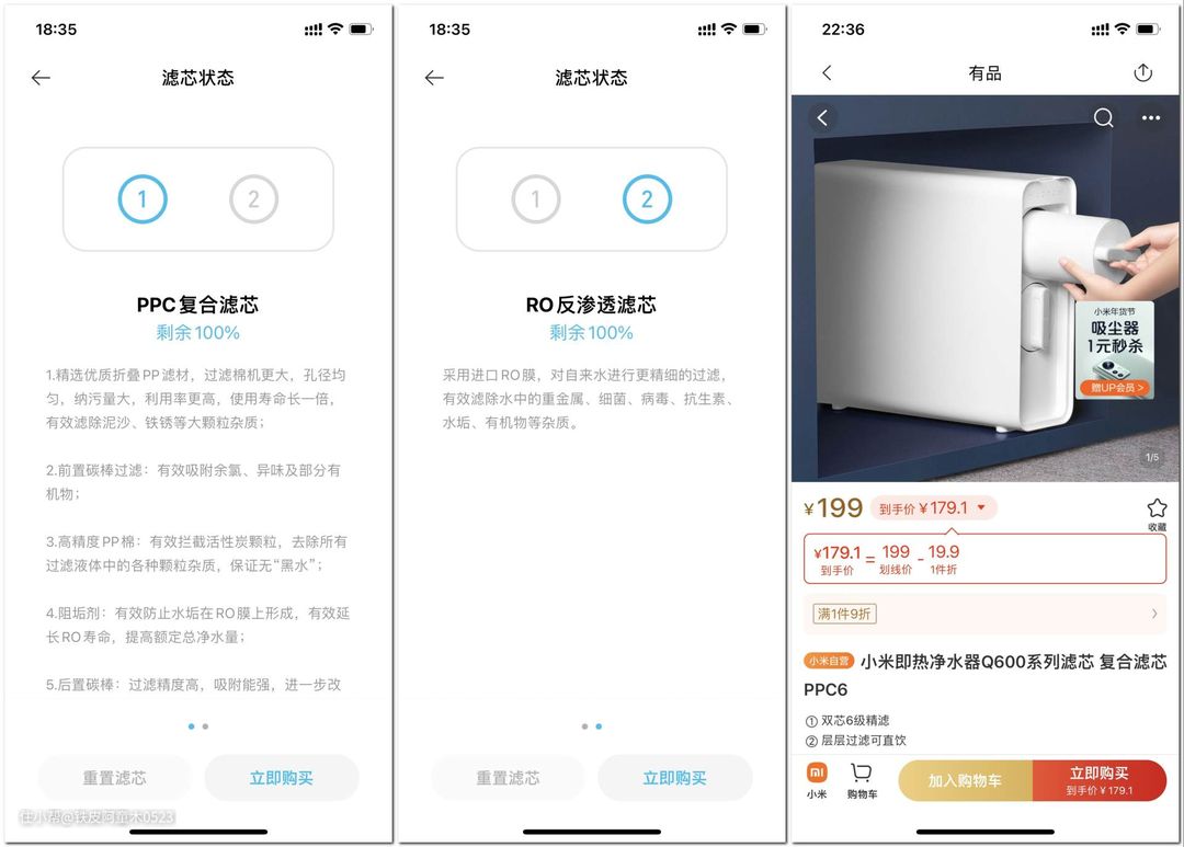 APP中还有滤芯使用情况与购买链接,需要更换滤芯时可一键下单,十分方便哦!