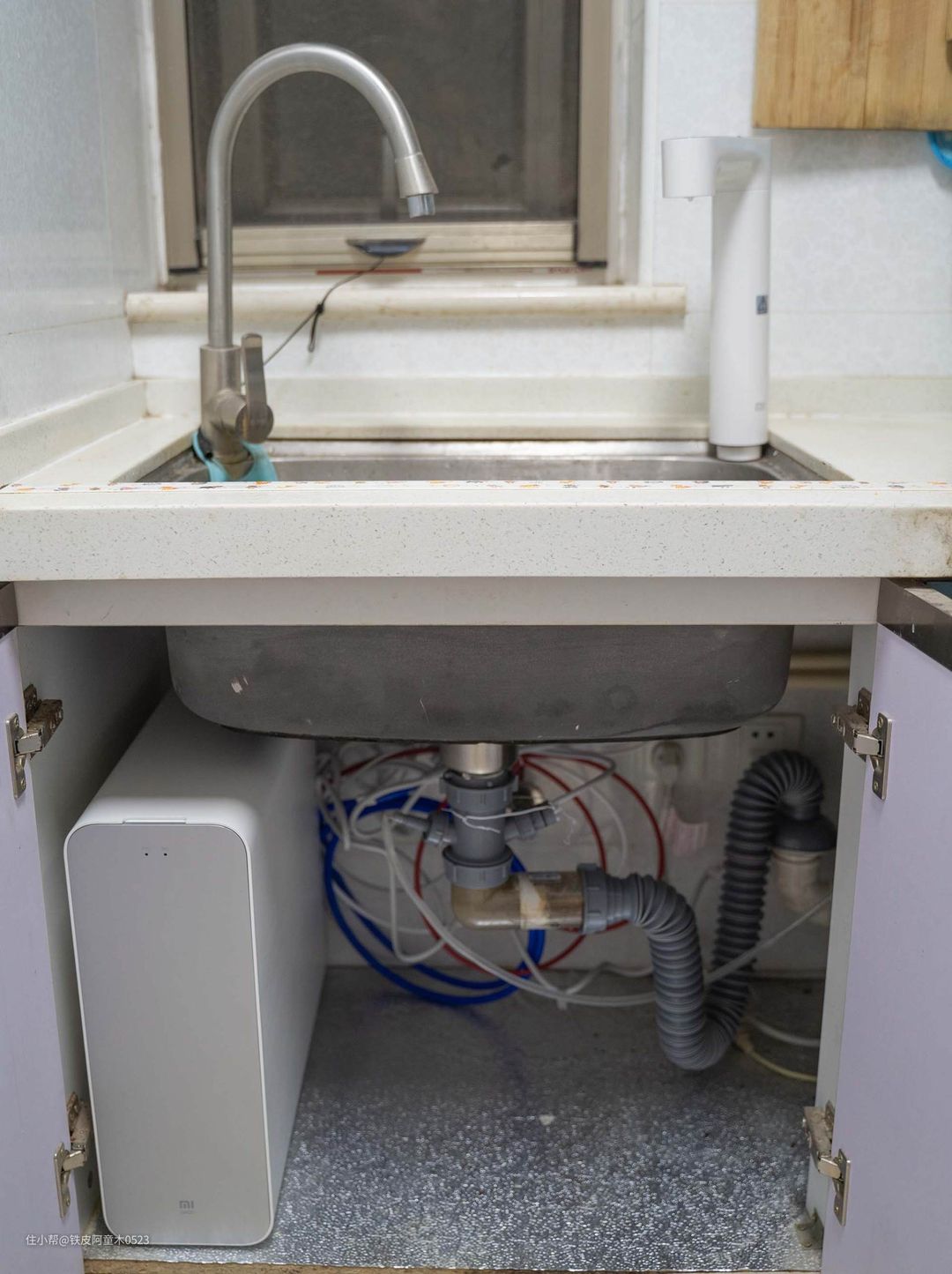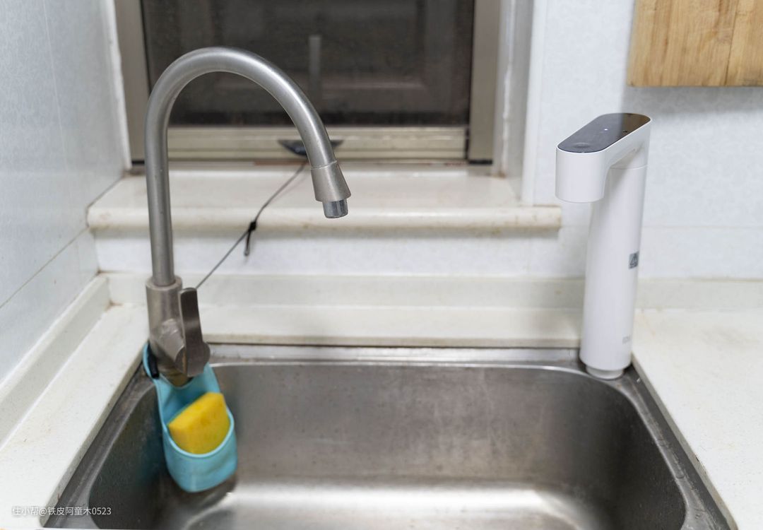 厨房水盆上方,左侧较细的水龙头为我家自来水+小厨宝的自来水出水龙头,右侧的白色水龙头为小米Q600净水器配备的智能水龙头。