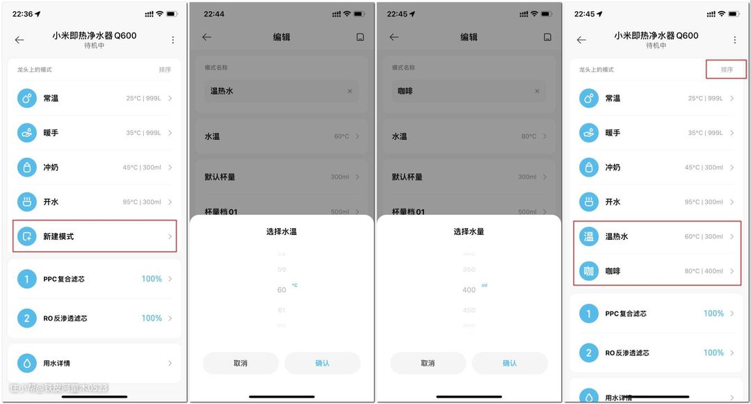 另外,还可以根据自己的需求来设置其他水温的不同模式,例如我还分别设置了60度温热水与80度咖啡温度,也根据常用水杯的不同容积,调整了默认出水量。另外,设置完不同模式后,也可以根据需求调整水温顺序哦!