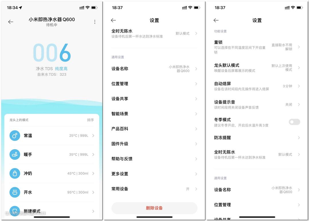 首先连接APP成功后,即可实时看到净水器的TDS值,包括自来水初始TDS值与净水后的TDS值。其次还有童锁、设备提示音、固件升级、防冻提醒等设置。