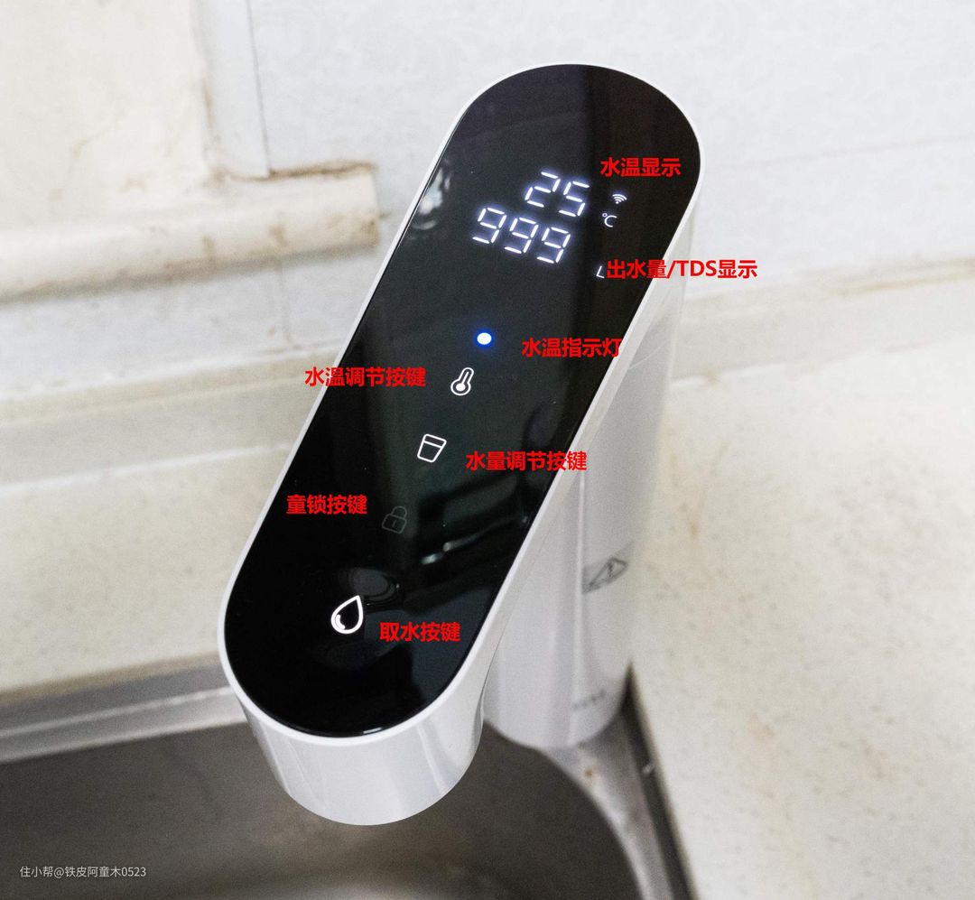 这款净水器配备的水龙头外观为白色主体,上方的触控面板为黑色,整体外观简洁大方,搭配不同风格的厨房装饰都看起来很舒适。