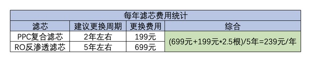 最后来简单预估下,每年我们要花销多少滤芯费用呢? 粗略估计来算,一年只需要239元左右,一天只需要6毛5分左右,整体滤芯价格来讲,是相当划算的!
