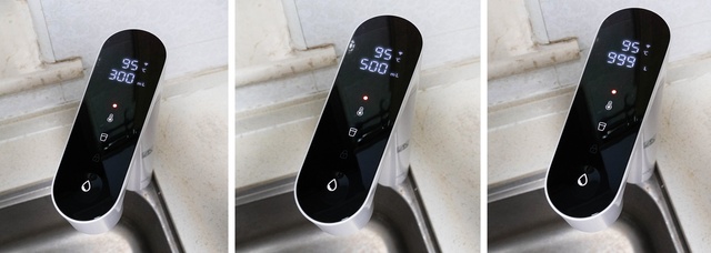 接水过程中,也可以根据需求来调整三档不同出水量:300ML、500ML、999L(无水量限制)。也可以根据自己的需求利用米家APP进行修改调整。
