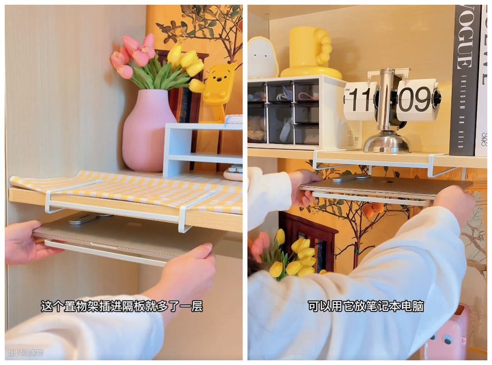 如果担心小宿舍内的置物空间不足,可以试着用这种简易式的隔板架,增加纵向收纳空间。