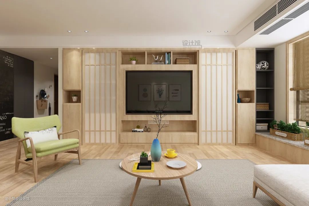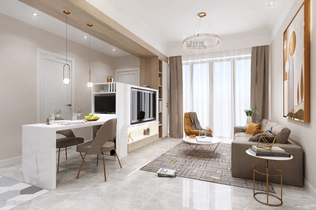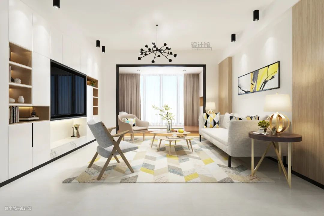 矮柜电视墙是一种视觉开阔的设计,适合没有电视墙、需要新砌电视墙的户型,直接采取矮墙或矮柜来替代电视墙,让客厅与电视墙后方的空间实现视觉上的打通,让客厅实现实用与通透的空间感。