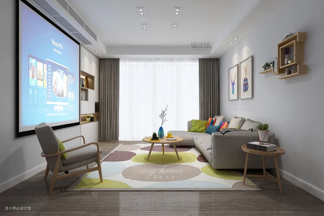 现代年轻人都比较喜欢看电影这种休闲活动,而在繁忙的工作后,还要特意跑去电影院又显得太累了;因此很多年轻人在装修的时候,就会考虑在家里安装投影仪,然后通过大尺寸的幕布,在家体验电影院般的观影效果;因此电视墙就可以丢掉电视柜,然后用投影幕布替代,把电视墙打造出投影墙,提供一个大屏舒适的家庭影院功能。