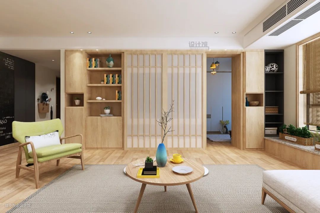 而通过推拉屏风造型,就可以露出藏在屏风后面的房门,实现简洁美观又实用的装饰效果,如下图: