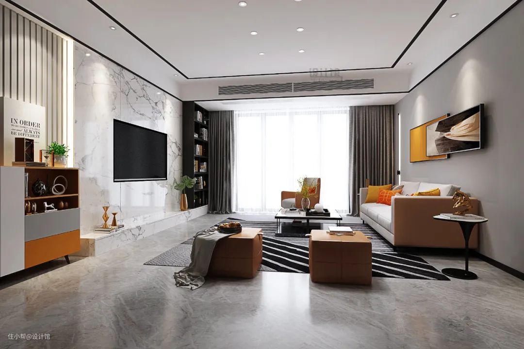 在岩板电视墙的基础,用大理石材质做地台电视柜,可以让电视墙保持统一的高级时尚质感。