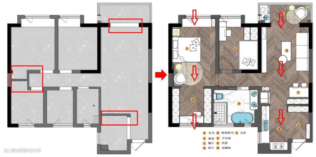 将阻碍通风的非承重墙打通,可以有效改善整体室内通风效果。