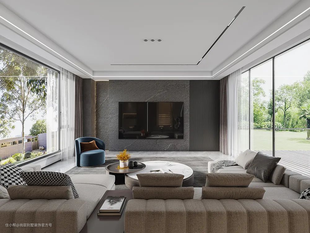 设计师采用极简轻奢风格,客厅迎合时下无主灯设计的潮流,让整体空间简洁明快。