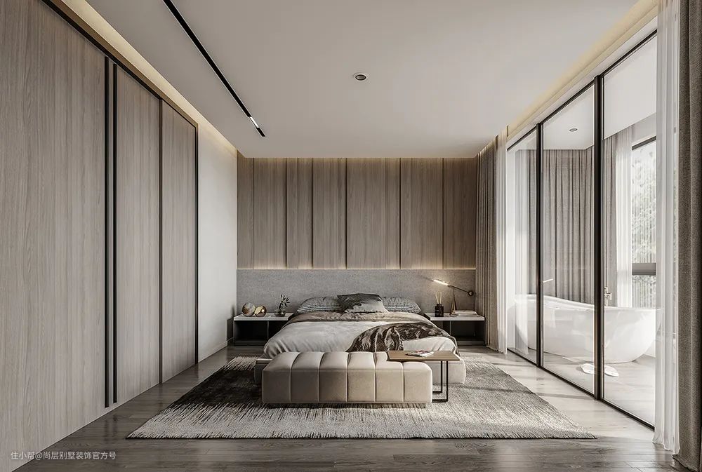 卧室的灯光以温馨暖和的黄色为基调,各种灯光交互使用,相互辉映,顿时给予空间静谧感。