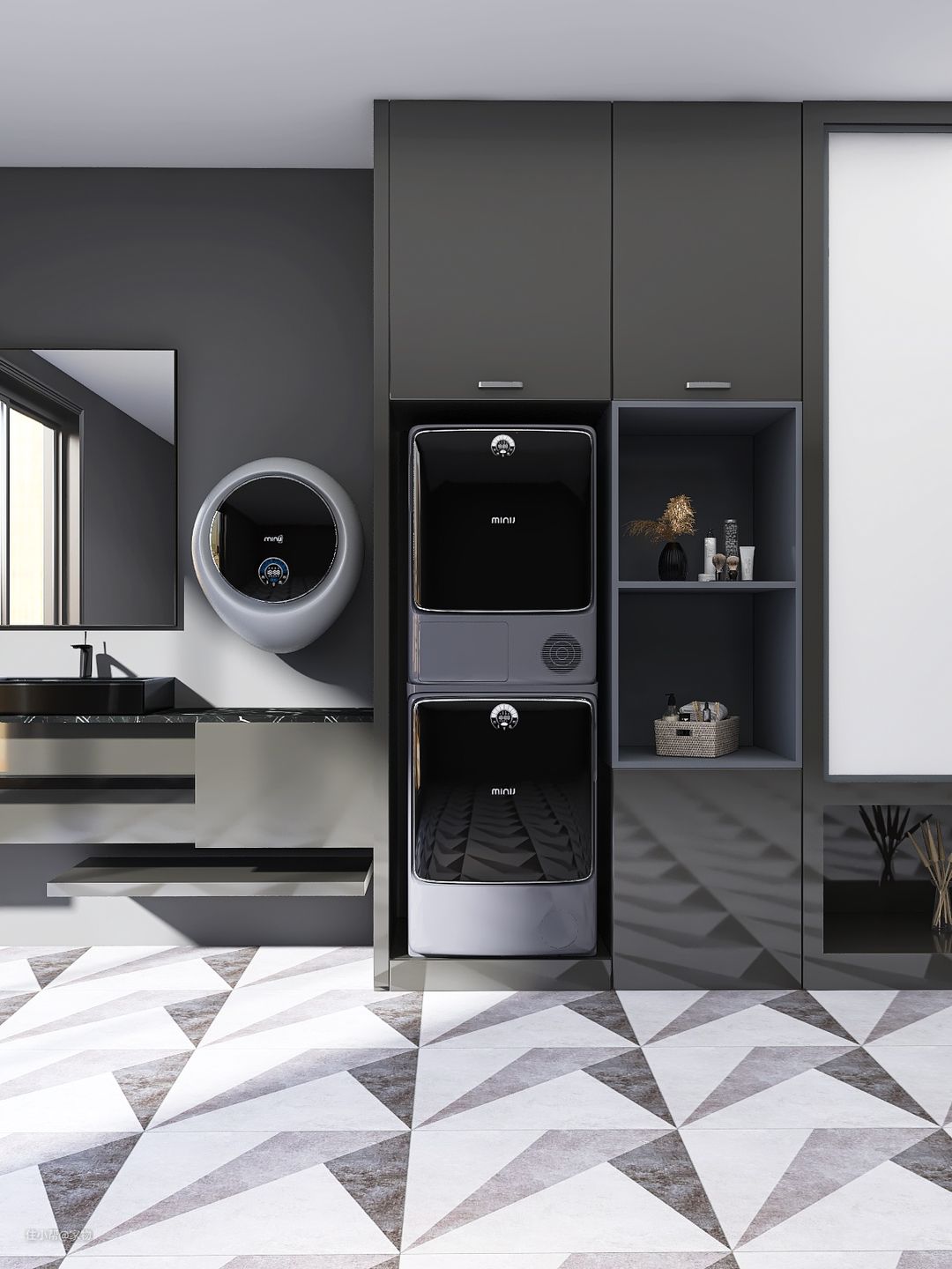 在洗衣区的设计中,如今叠放也很受欢迎,可以说,这种摆放方式,在利用纵向空间、节省空间方面,真的是最优选。