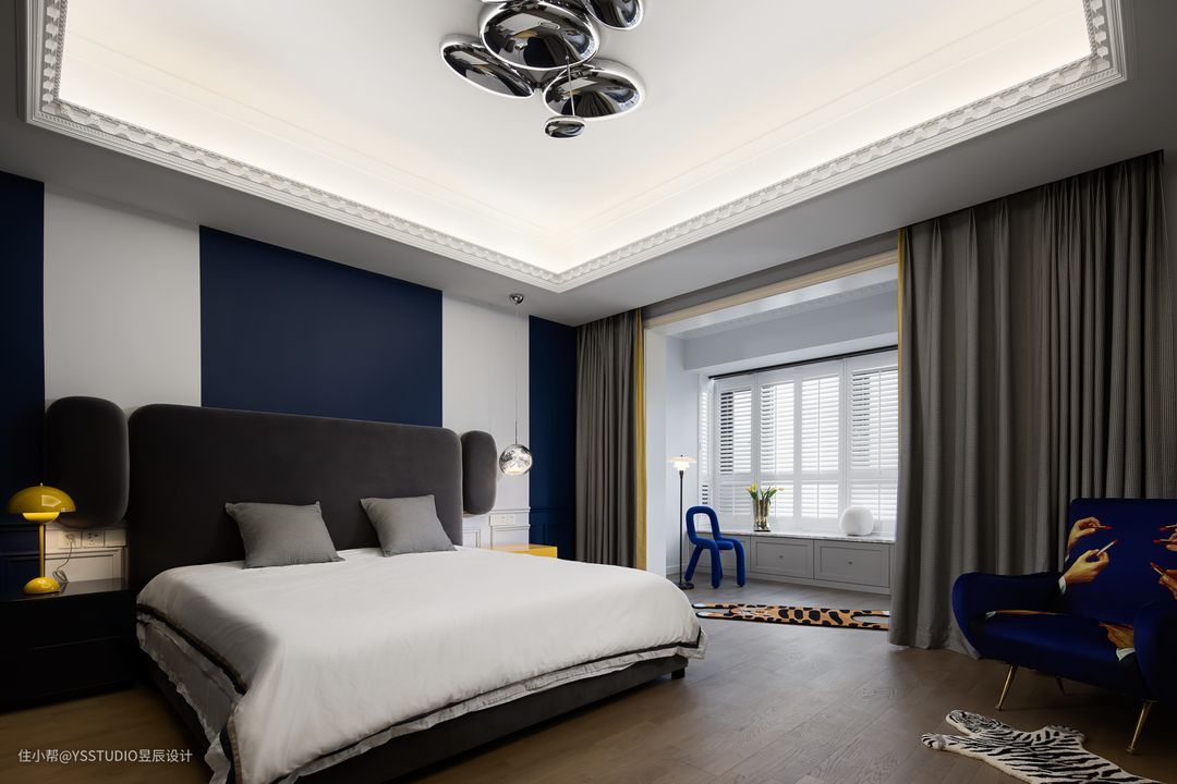 主卧延续了流动的蓝色,再大面积的使用了灰色和酒红色。