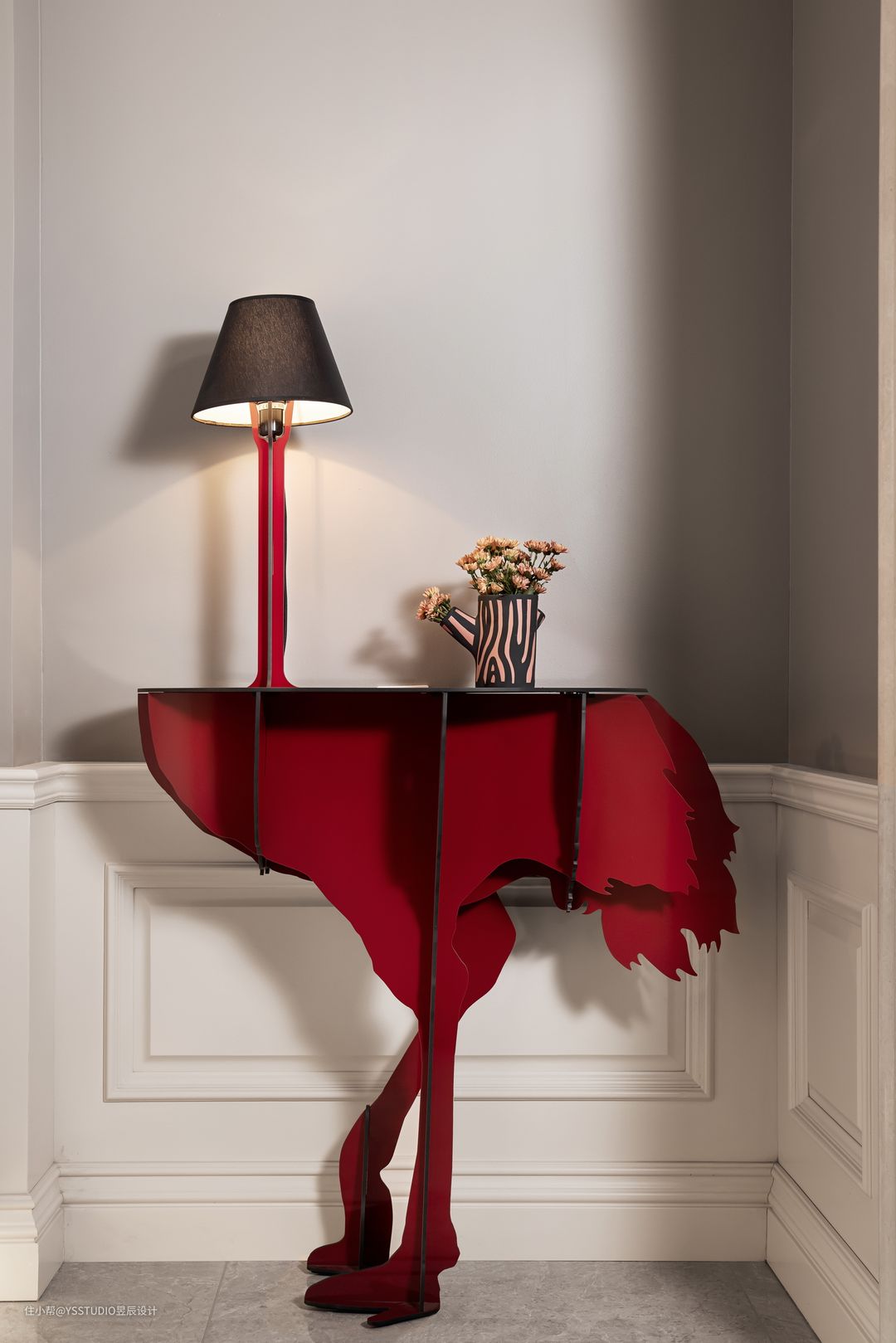 车库入口处则有一只葡萄红的鸵鸟落地灯,它来自法国品牌Ibride。