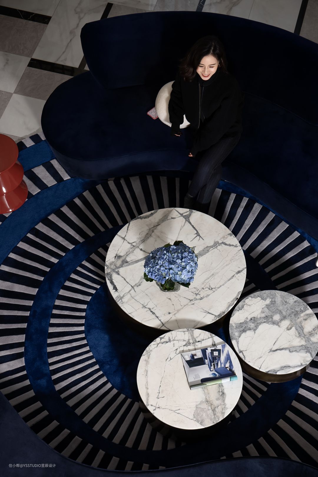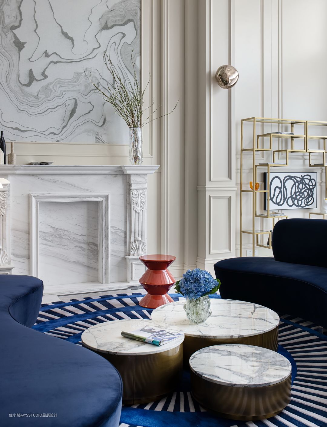 地毯上放置着蘑菇城茶几,由进口大理石月灰石台面和黄铜底座组成。红色小边几则是蓝白空间的那个惊叹号,让这幅画面的色调又上升了一个新的维度。红蓝白这三个颜色在这幅画里搭配得刚好。