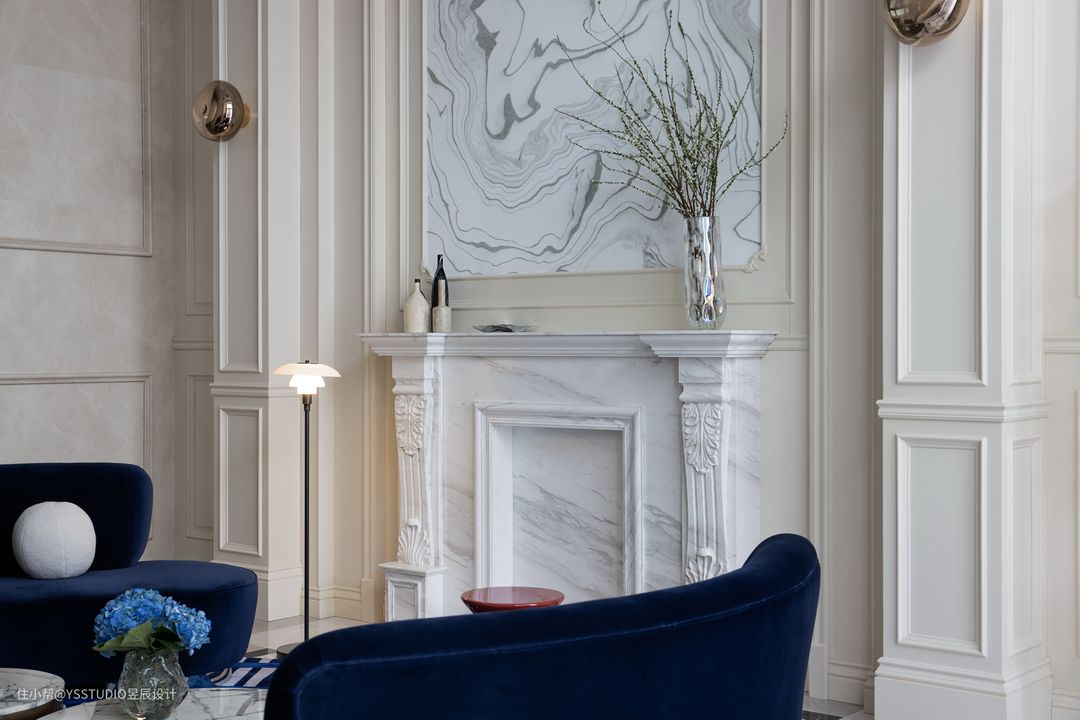 在颜色的选择上,我们让这一抹流动的蓝蔓延了整个起居室。