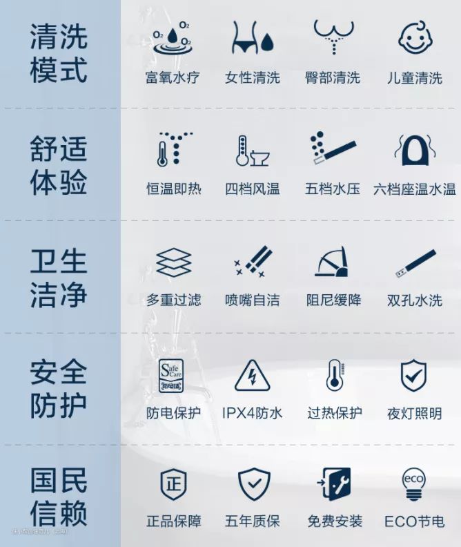 漏电/防水保护:国内的卫生间不比日本,很多家庭都没做干湿分离。所以要注意防水和漏电保护,国内主流智能马桶盖都达到了国家标准的IPX4防水等级。