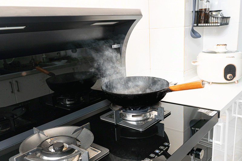 以下是爆炒时,我的这款集成灶的吸烟情况,吸的非常干净,一是19m³/H的大吸力,二是基于比传统烟机更近的吸烟距离。注意这是油烟,不是很多商家做实验的水汽,油烟要比水汽难吸干净。同时不仅吸得快,还没有跑冒烟的情况。