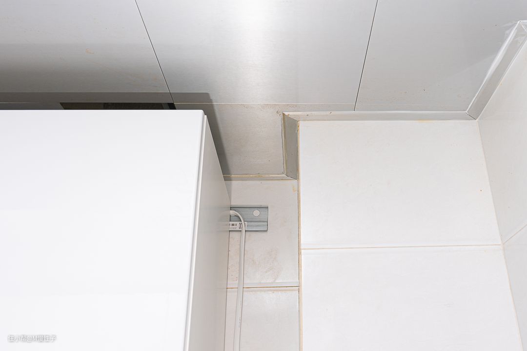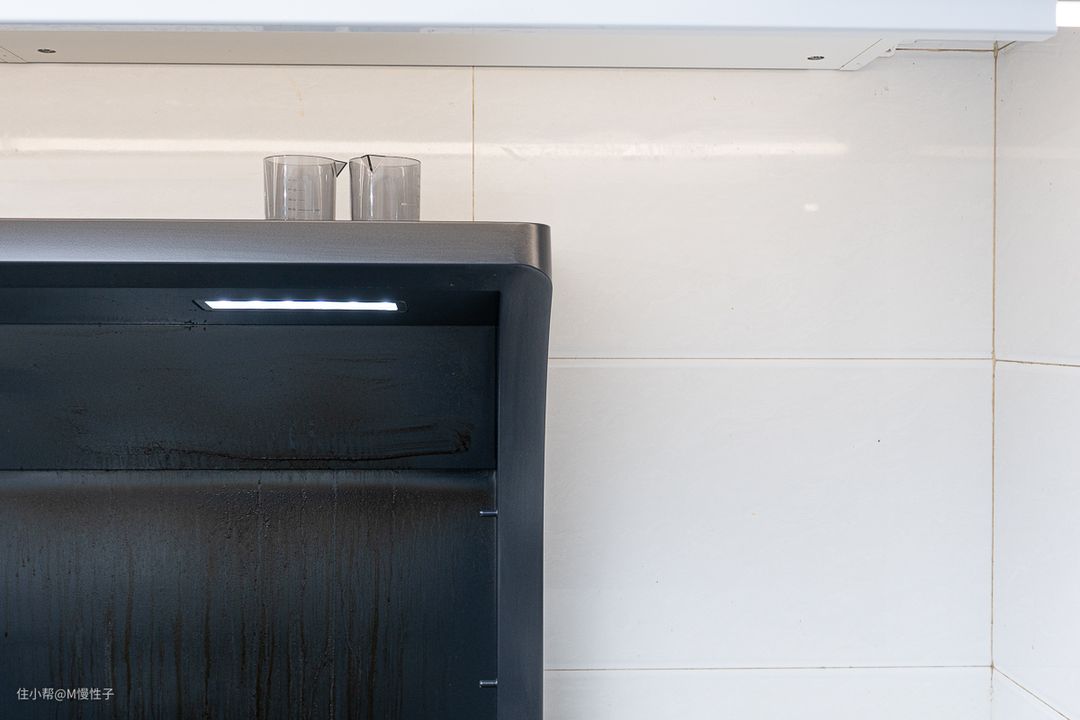 再看吸烟口侧面的瓷砖,非常的干净,没有传统烟机周边的黄色残留,并且这还是经常爆炒的一侧。再看吸烟口的顶部,上面距离不远就是吊柜的底板,集成灶从买来后,这个位置就没有清洁过,除了少量的水汽残留,没有黄色的油渍,同样非常干净。油烟不过脸,使用起来也更健康。