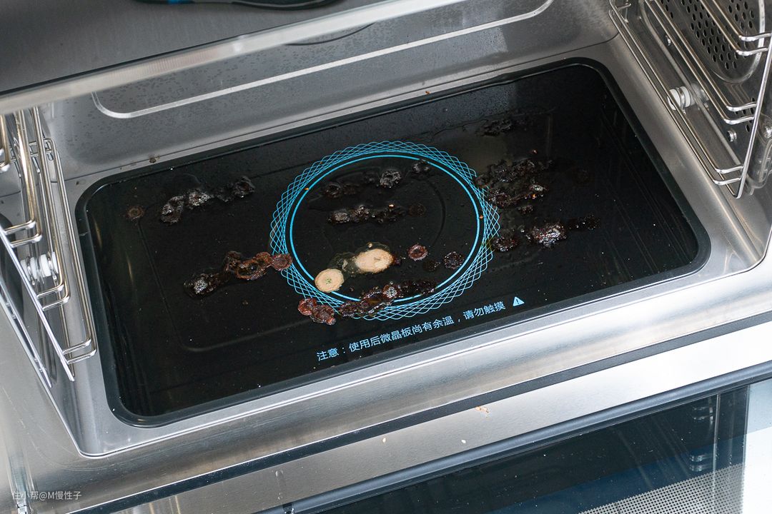 烤制羊肉串后,底部的面板,即使有大量的凝固污渍,配合自带的蒸汽清洁程序,抹布清清一抹就能清洁干净。总体清洁是非常方便的,没有清洁死角。