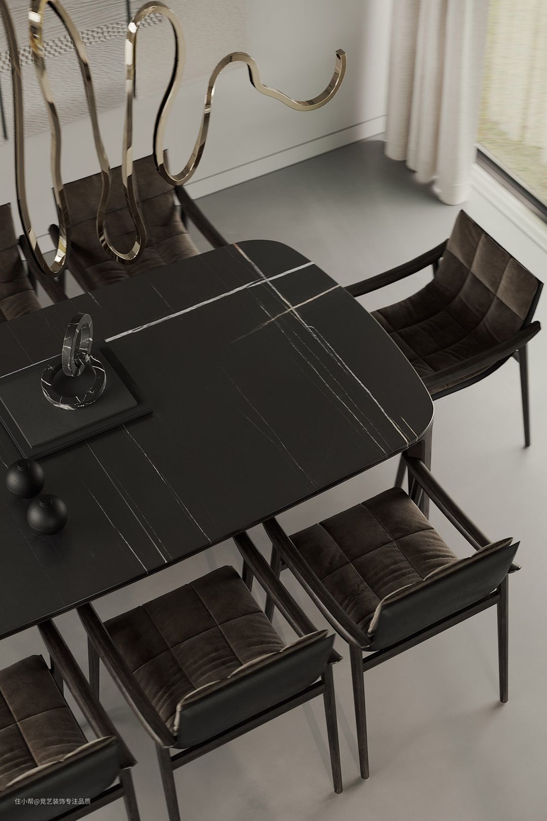 一盏精美的现代 餐厅吊灯在现代黑色餐桌上方勾勒出一条火热的波浪线。