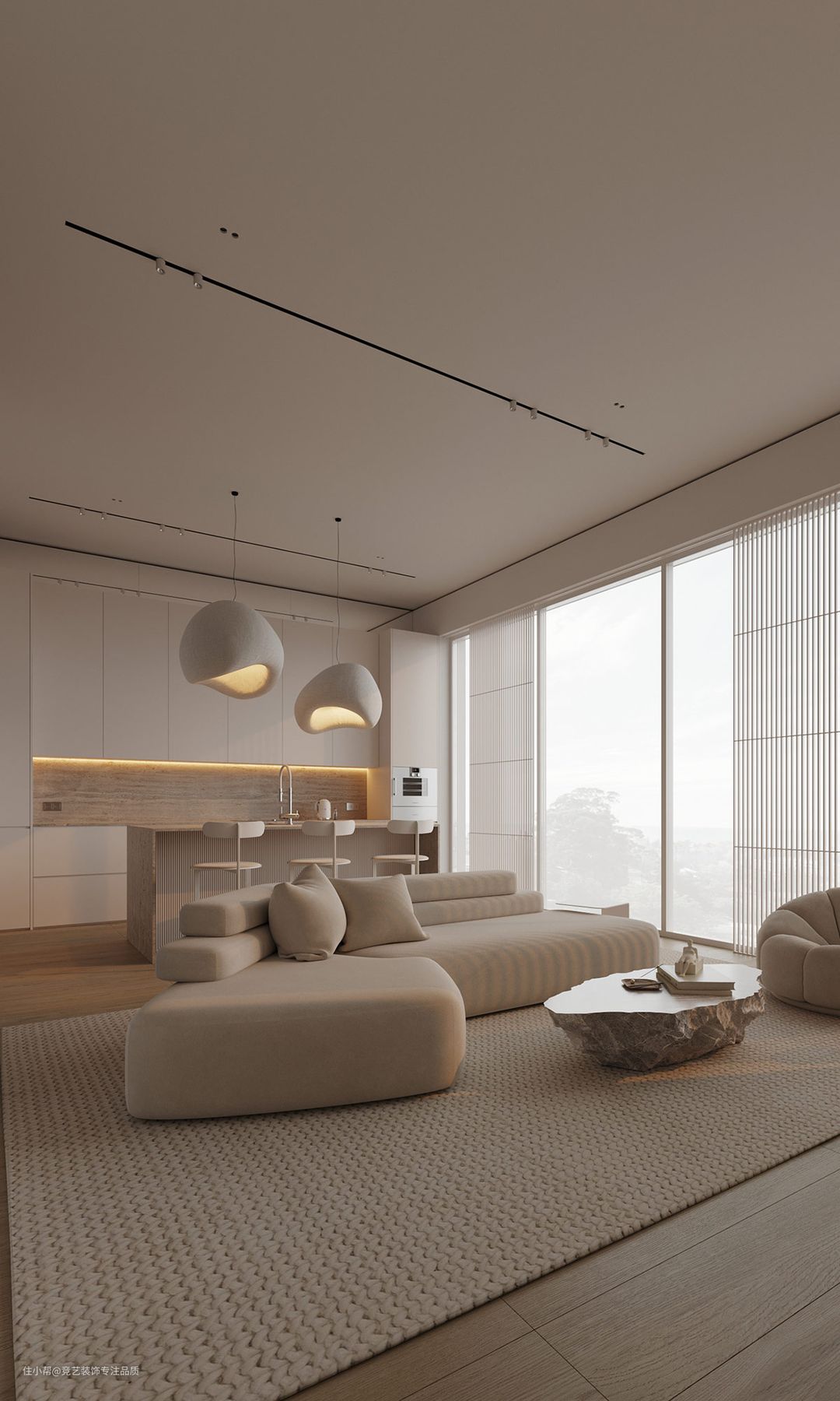 编织的客厅 地毯增添了一种极具吸引力的质感。厚实的地毯勾勒出休息区的轮廓,将其与邻近的厨房和餐厅区分开来。