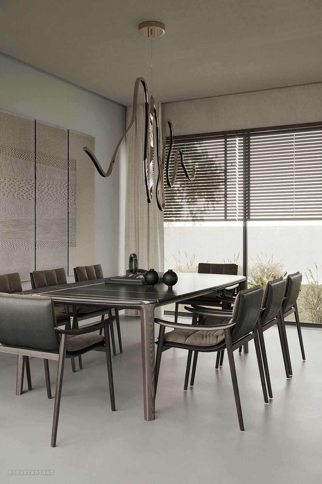 3D 浮雕多联画为正式用餐区营造出迷人的背景,而其浅色系则使其无法挑战个性吊灯。