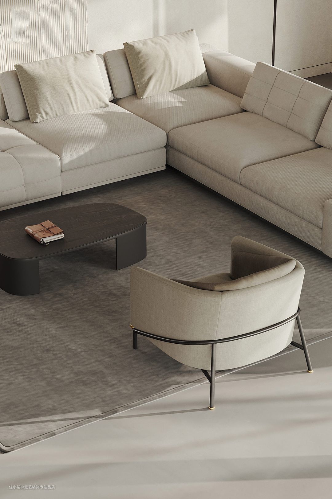 别致的客厅椅子完成了时尚的休闲家具布置。浅灰色的地毯软化了无缝的灰色微水泥地板。