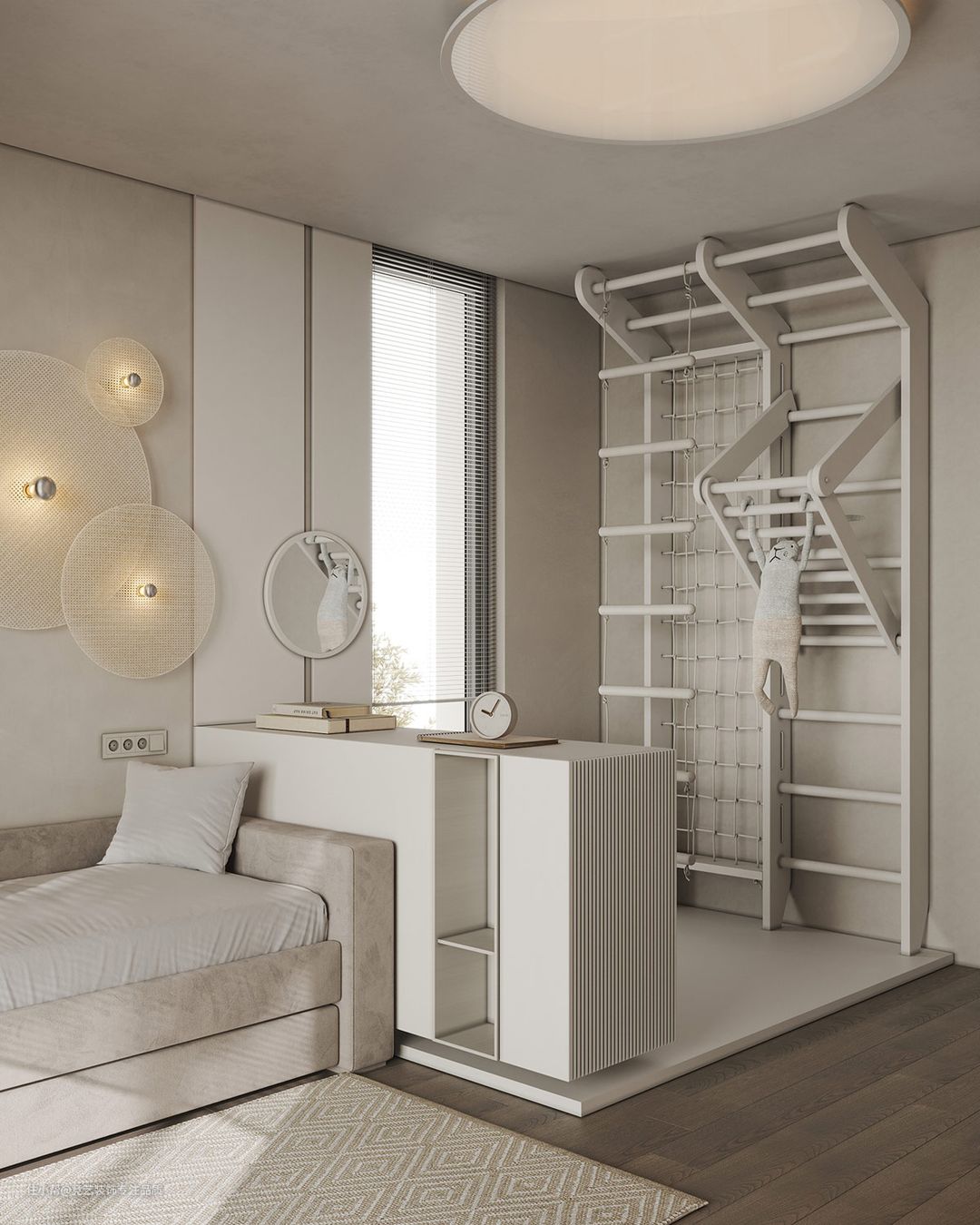 在孩子们的床对面的墙上,一个浮动的梳妆台/书桌从衣柜的墙上突出来。在这里,一个装饰花瓶给卧室一个更成熟的外观。