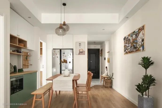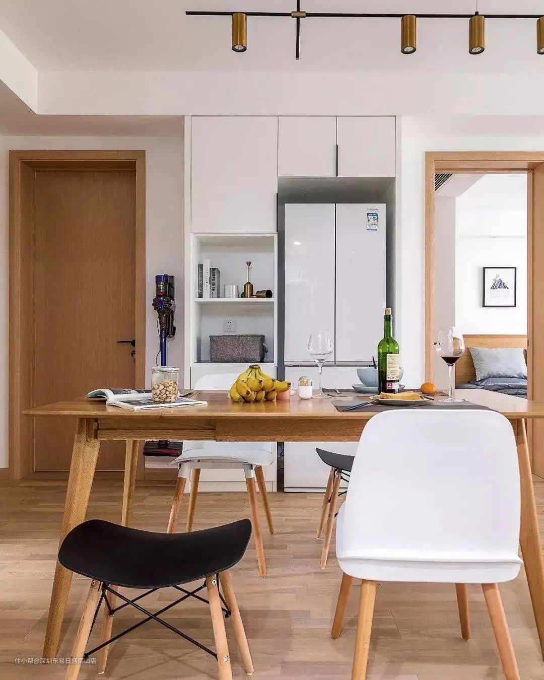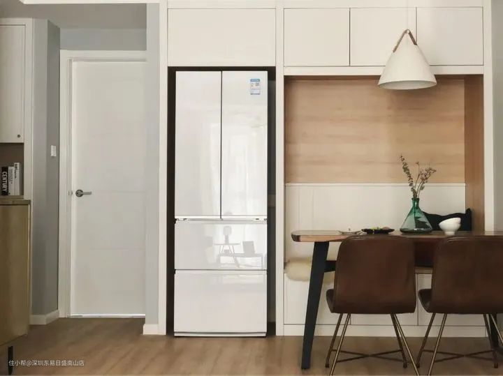 小户型没有西厨,可以放在餐厅,存取都很方便,为了让空间的利用率扩大,多会选择定制餐边柜,这样就可以考虑把冰箱嵌入到餐厅的餐边柜里面,取用也更加省心。