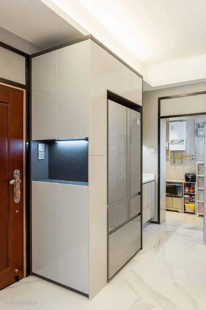玄关处则可以利用一侧内嵌冰箱,一侧保留玄关功能,这样采购完的物品能及时放置,便捷生活。