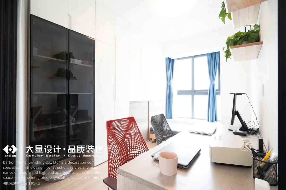 与客厅不同,书房一整面墙的储物柜,黑色透明玻璃的书柜因为才入住没多久还没能完全填充,但是工作台上已经布满夫妻二人工作的用具。
