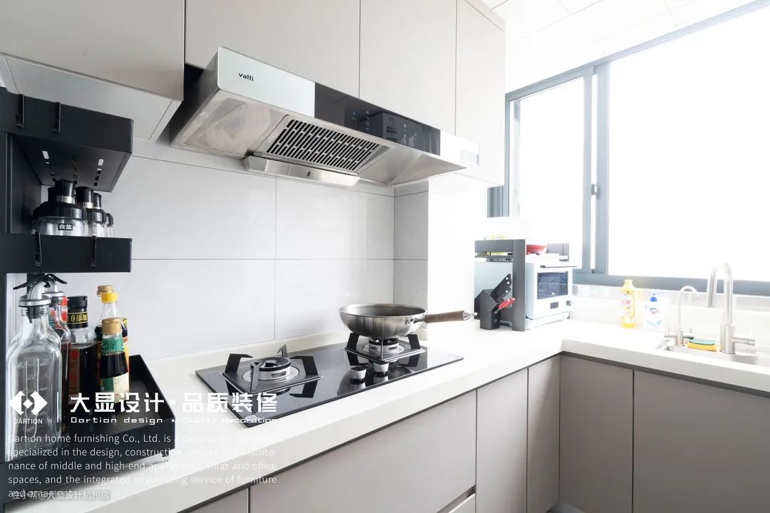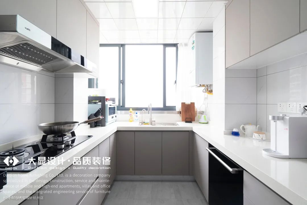 餐厅往前就是厨房,设计师把原本的空间比较小的北阳台并入厨房,使得厨房空间扩大,厨房为U型厨房,灰色的橱柜搭配白色的瓷砖,给人以独特的质感。