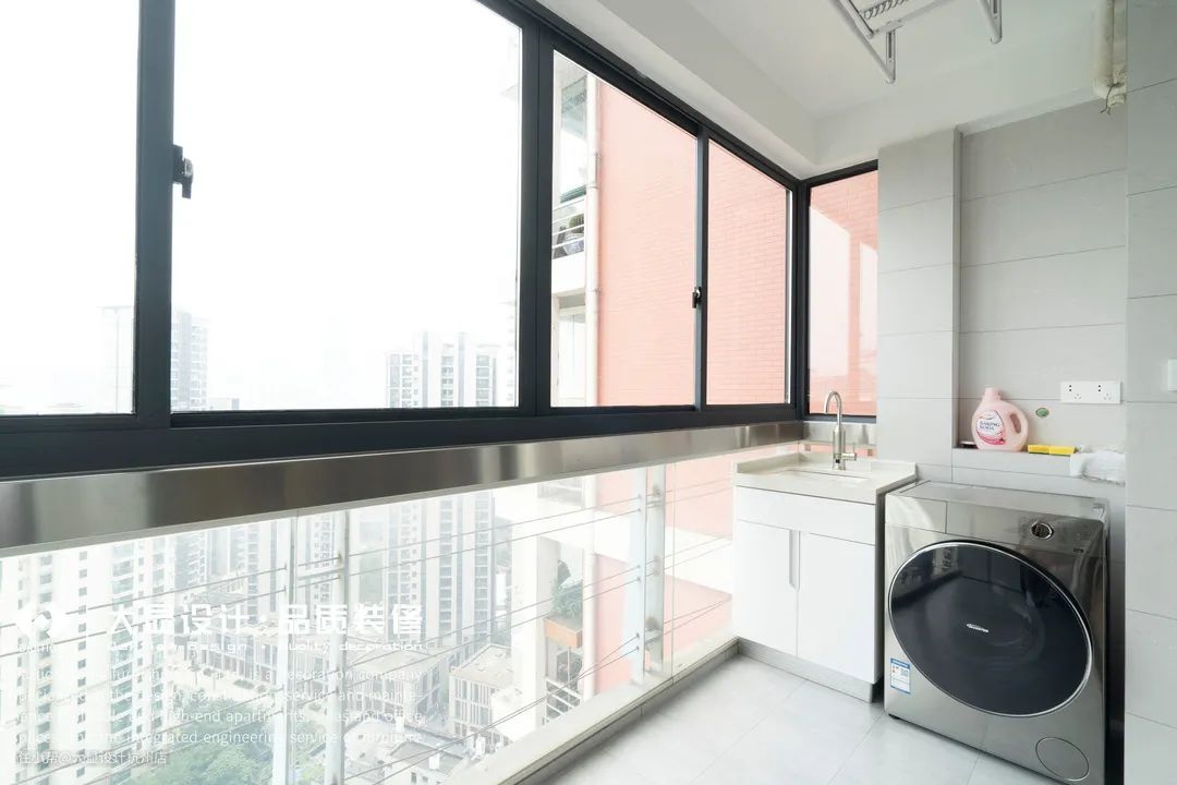 阳台大而明亮的窗户,能够俯瞰外面的景色,洗衣区被安置在阳台一侧,另一侧设有储物柜增加储物空间。