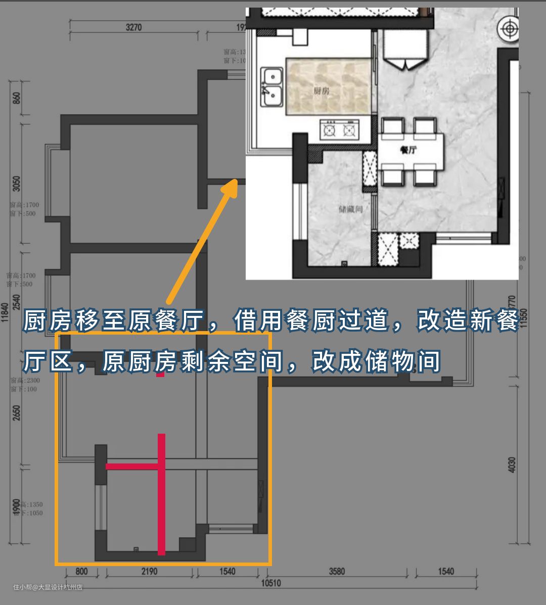 原餐厨空间较小,规划不合理,所以我们在此做了一个较大改动,厨房搬至相对宽敞的餐厅位置。
