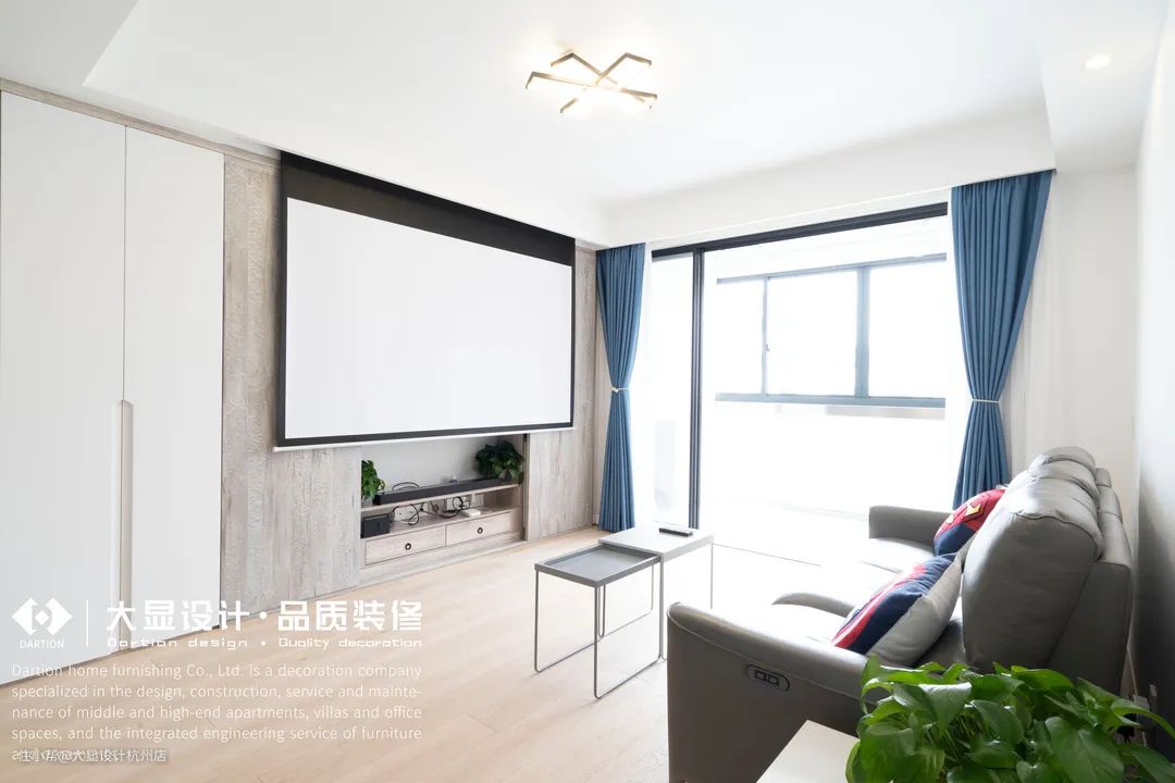 而电视背景墙做木质柜,简洁大气,两侧柜门做可移动式,有三种打开方式:移至两边,可看电视;移至中间,两侧展示落地书柜,变身文艺书房;安装投影仪,放下幕布,又可做家庭影院,观看球赛,氛围满满。