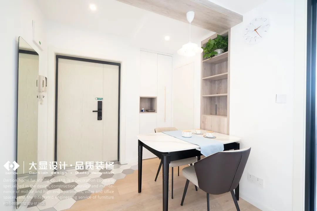 入户过道非承重墙拆除,借用一点餐厨与过道空间,做现在的餐厅区;而餐厅吊顶,将顶面缺陷设计的特殊吊顶,反而成为优势。