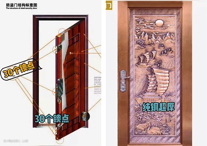 普通一扇国标甲级防盗门,电钻钢锯30分钟都打不开,那些大几千上万的防盗门,什么30个锁点、1小时防暴力开门、纯铜超厚,根本没必要。