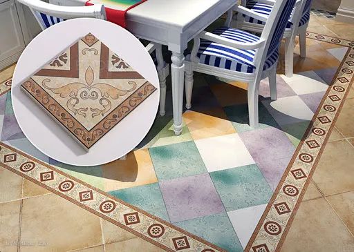 还有拼花地砖、角花和波打线,用来给大空间划定分区和定位,但是家具陈列是会变动的,可以全盖住倒还好,盖不住露出生硬的波打线难看又鸡肋。