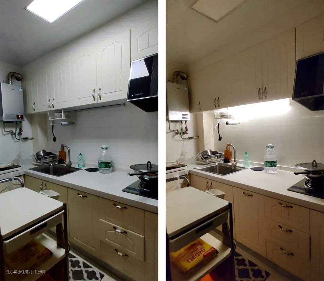 厨房不需要装顶灯,在吊柜下面装一条灯带,用作橱下照明,不开大灯也完全够亮。