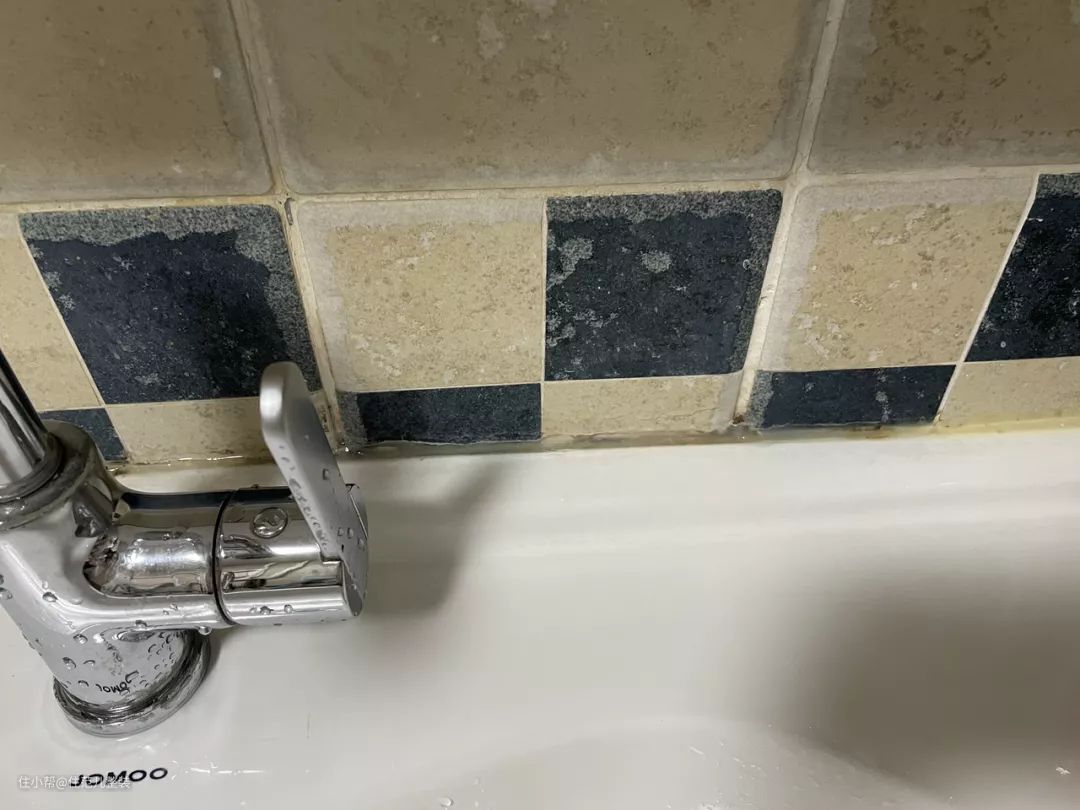 其次是马桶下方与地砖连接的地方,浴缸和墙壁连接的胶,台上盆与台面之间的胶。