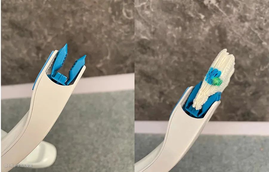 记住在安装刷头的时候,推动马桶刷上的按钮,直到听见“咔嚓”一声脆响,刷头才被固定住,不然可能一塞入马桶,就报废掉。