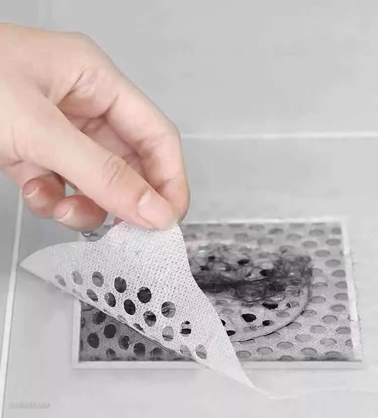 如果你觉得平日里下水口很容易淤积头发,清理起来费劲,可以选择带网眼的无纺布贴在地漏上,定期揭下来扔掉就好。