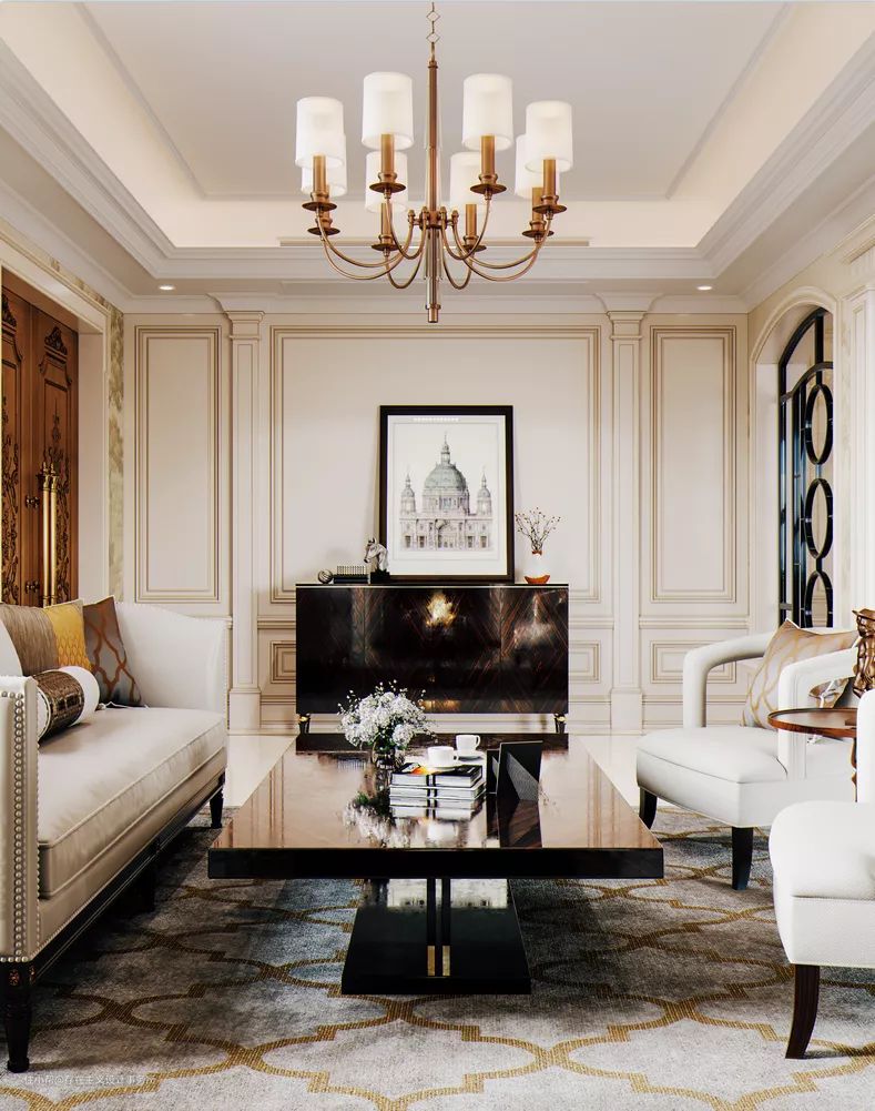 P1轻奢法式风格的客厅装修设计参考,客厅整体以干净的石膏线墙面、奶茶色与白的主色调、精致的黄铜装饰等。