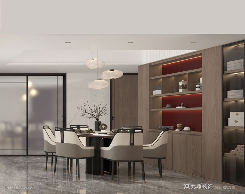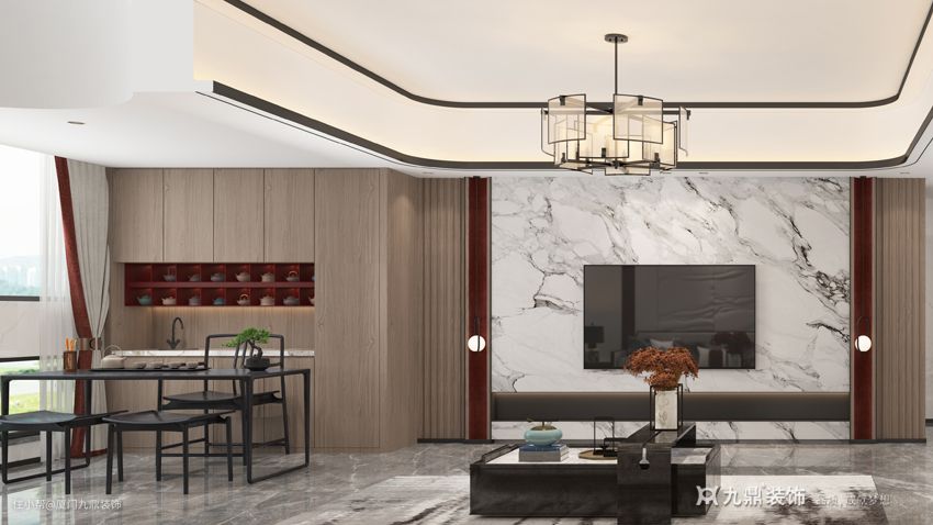 设计师以客厅、餐厅和茶室形成一个公共区域,又用典雅的中式风家具与简洁硬装相结合,打造出一个现代中式,雅典大气的家。