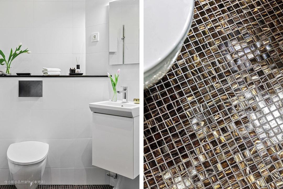 3平米的卫生间内以白色墙面为主,地面铺贴了褐色马赛克地砖,体现出精致轻奢质感,洗漱柜、马桶假墙收纳组合满足洗漱、洗浴用品等置放,保持卫浴空间整洁有序。 看完这样超美的小公寓装修设计,难怪邻居们羡慕呢!