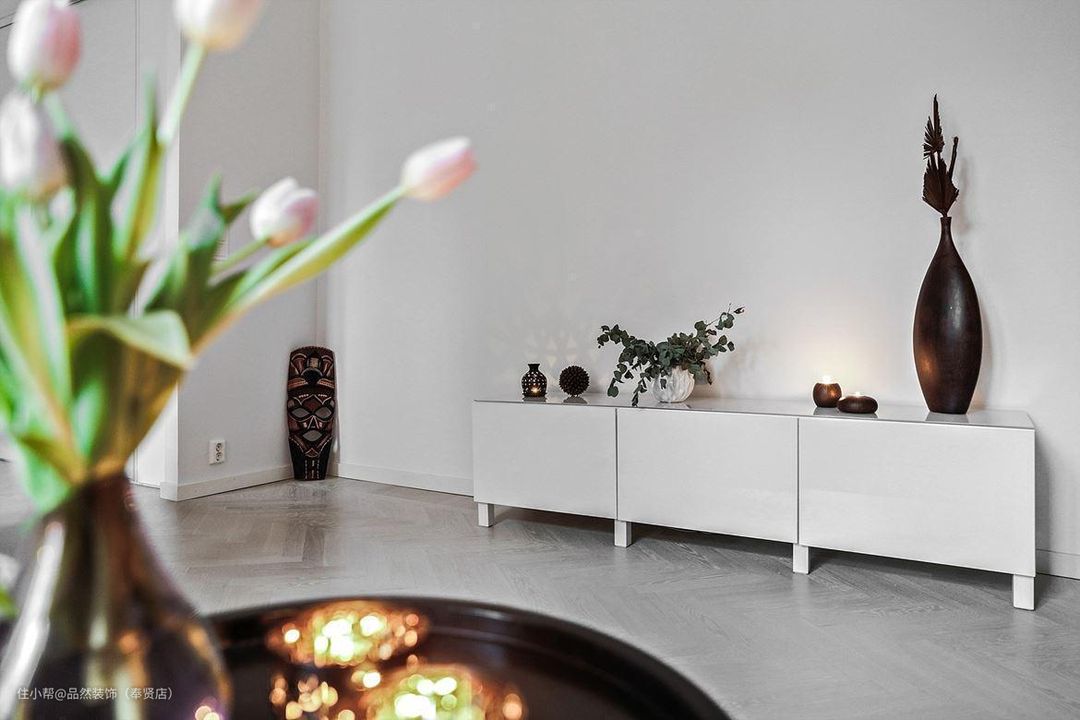沙发对面的白色电视背景下摆放一个简约时尚大气的实木电视柜,储物空间十分充足,台面上舍弃了电视,但美中精美的饰品、小夜灯和绿植等搭配恰到好处,增添了室内的格调和艺术氛围。