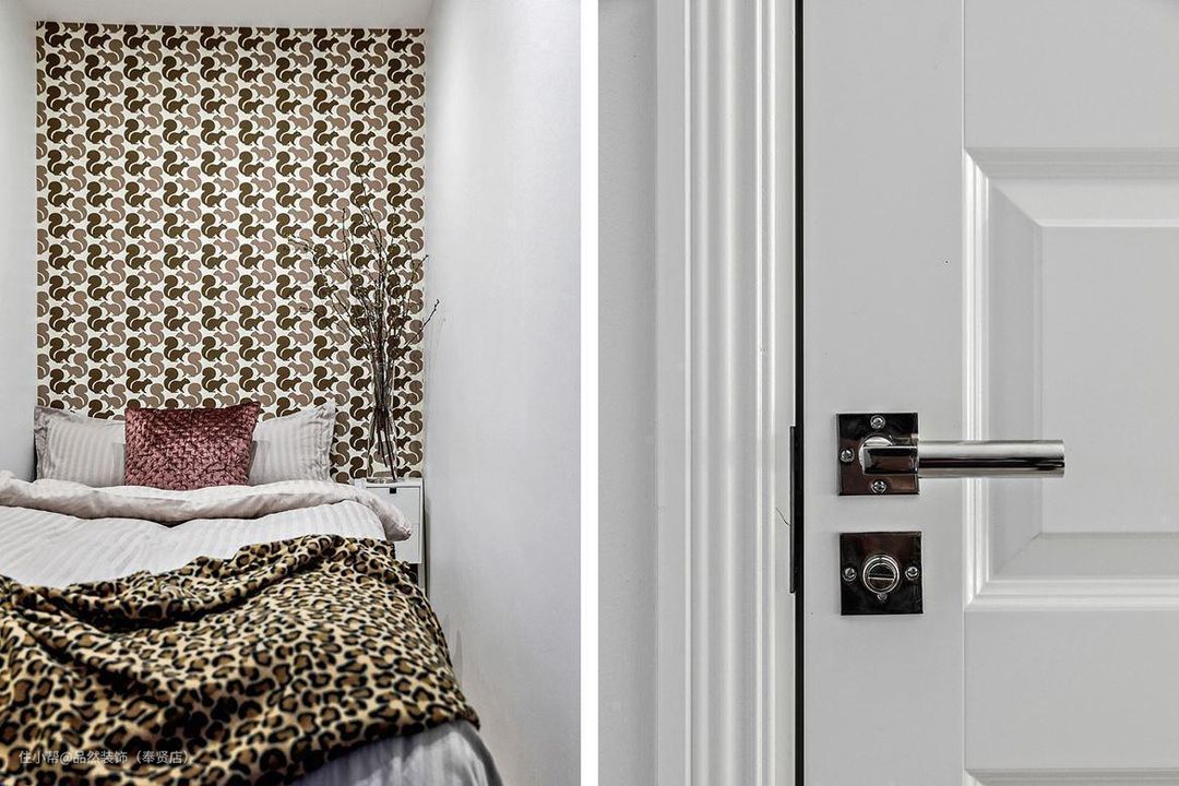 卧室内空间局促,只摆放了一张宽大的双人床,过道十分狭窄,拖鞋放到地下在再穿时都不好找,容易弄到床底下,因此只能放在门口处。但小卧室内部布置得还是很温馨的,床上铺着柔软舒适的床品,在土黄色图案背景墙衬托下,营造出安静轻松的睡眠氛围。